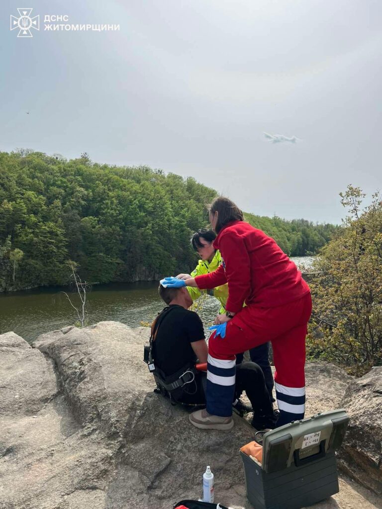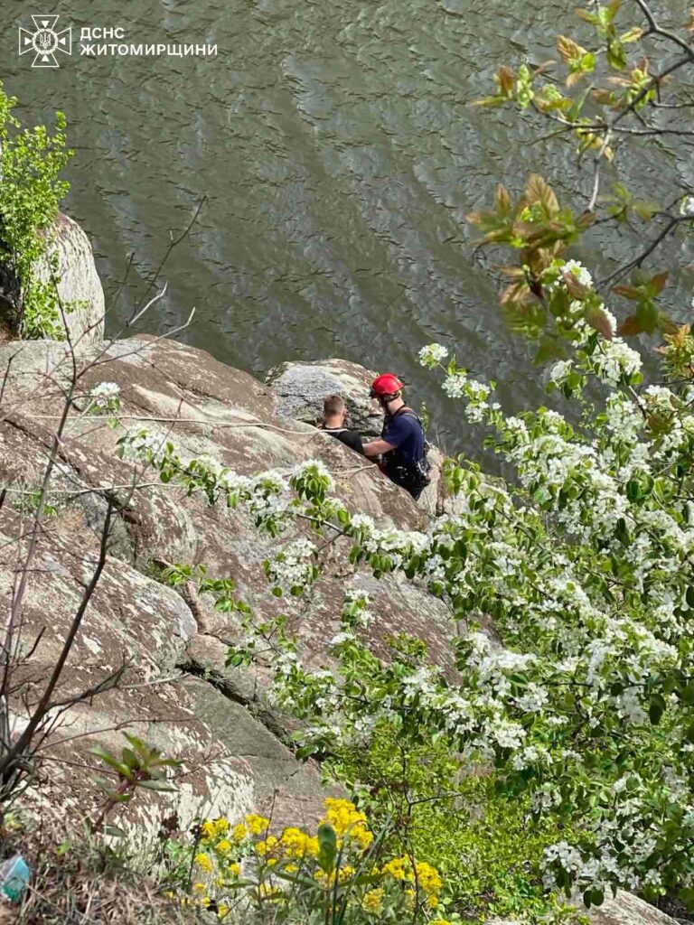 «14 квітня о 14:10 до Служби порятунку «101» надійшло повідомлення про те, що у Житомирі зірвалася зі скелі людина, потрібна допомога у його піднятті. За вказаними координатами оперативно виїхали бійці аварійно-рятувального загону спеціального призначення», – розповіли у ДСНС.