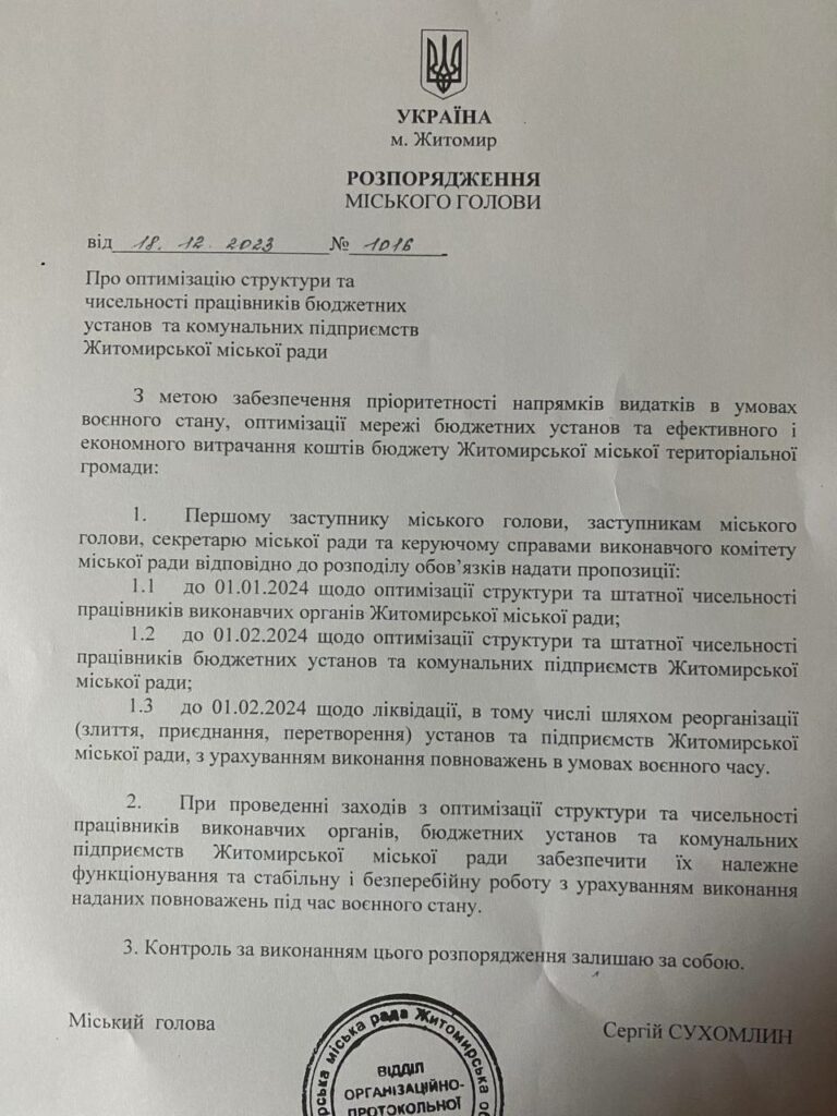 У Житомирській міській раді назріває чергова «оптимізація» штату. Про це йдеться у розпорядженні міського голови Сергія Сухомлина, оприлюдненому на сайті мерії.