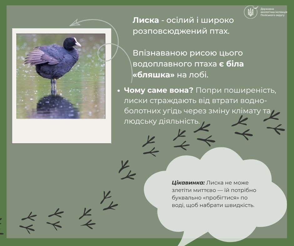 Українське товариство охорони птахів обрало (https://birdlife.org.ua/amateur-science/birdofyear2026 ) символом 2026 року лиску – впізнаваного чорного водоплавного птаха з білою «бляшкою» на лобі. На Житомирщині та Рівненщині ці птахи є дуже поширеними на озерах та річках.