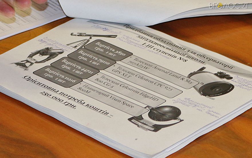 «Особливість будівлі нашої школи дозволяє зробити такий оглядовий майданчик, якого немає навіть у Житомирському державному університеті імені Івана Франка (на базі вишу діє астрономічний науково-дослідний центр, – ред.). Коли ми підходили до вибору технічного оснащення, то керувалися принципами доцільності. Ми обирали ту техніку, яку можна купити в Україні. Так, телескоп Arsenal Land & Sky невеликий за розміром, його встановити на балконі школи (саме через нього нам заздрить університет), а ціна – 3 тис. 850 грн – вдвічі менша, ніж в Інтернет-магазинах. Про цей телескоп дуже хороші відгуки – він дозволяє побачити, наприклад, моря і кратери на Місяці» – розповіла директор школи Наталія Лавриненко.