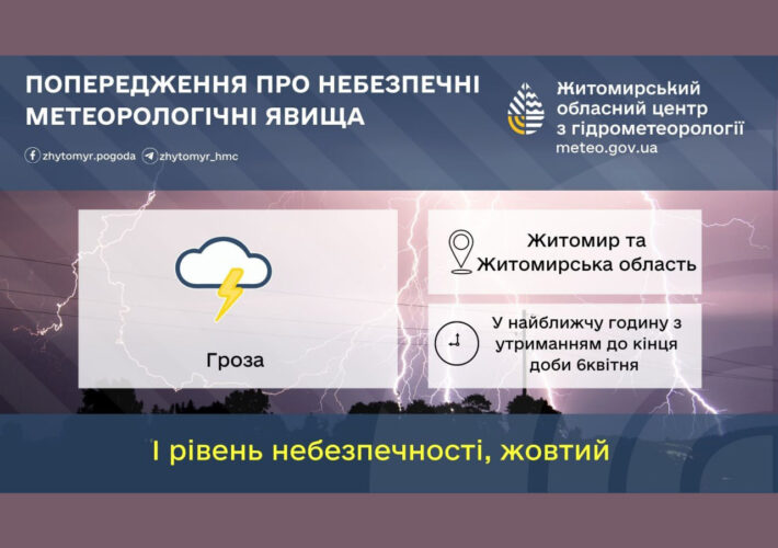 В найближчу годину з утриманням до кінця дня 6 квітня у Житомирській області та у місті Житомирі гроза (І рівень небезпечності - жовтий)