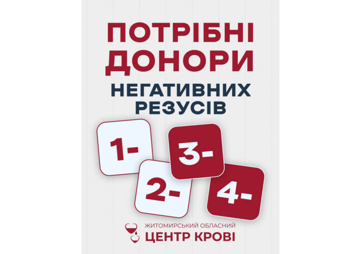 Житомирський обласний центр крові має потребу у донорах з негативним резус-фактором (1−, 2−, 3−, 4−)