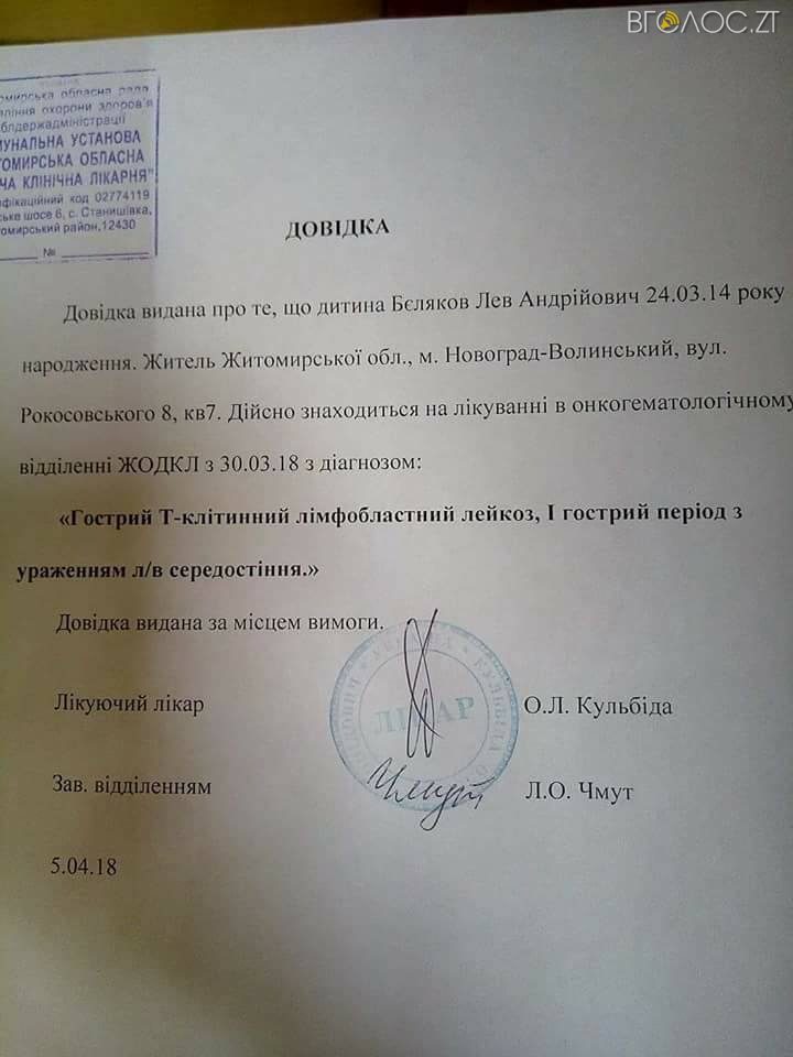 Термінової допомоги потребує 4-річний Лев Бєляков з Новограда-Волинського. Хлопчику поставили діагноз – гострий лейкоз. Про це в соціальній мережі facebook повідомили волонтери.