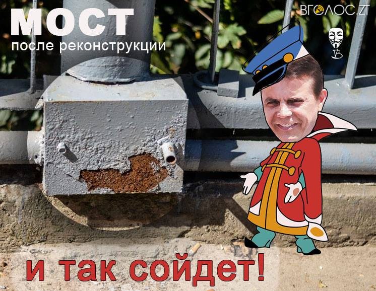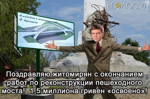 Мова йде капітальний ремонт житомирського підвісного пішохідного мосту в парку відпочинку ім. Ю. Гагаріна. У міській раді обіцяли, що житомиряни приємно здивуються, побачивши результати роботи. Так, здивуванню не було меж, коли жителі міста побачили, що після ремонту практично нічого не змінилося. Як пізніше пояснили журналістам, міст “піскоструїли” та фарбували….