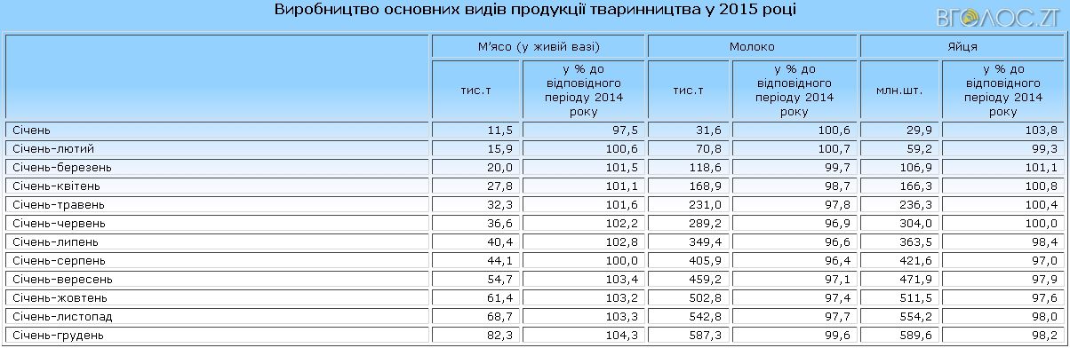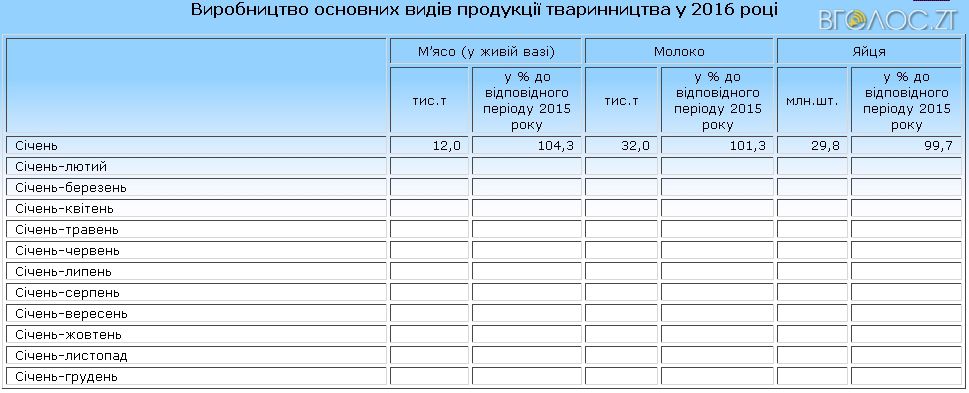 За даними головного управління статистики в області, за січень м’яса на Житомирщині виробили 12 тис. т, що 4,3 % перевищує минулорічний показник. Водночас виробництво молока за перший місяць 2016 року становить 32 тис. т – це на 1,3 % більше, ніж торік. Хоча яєць поки що вироблено на 100 тисяч штук менше, ніж у січня 2015-го.