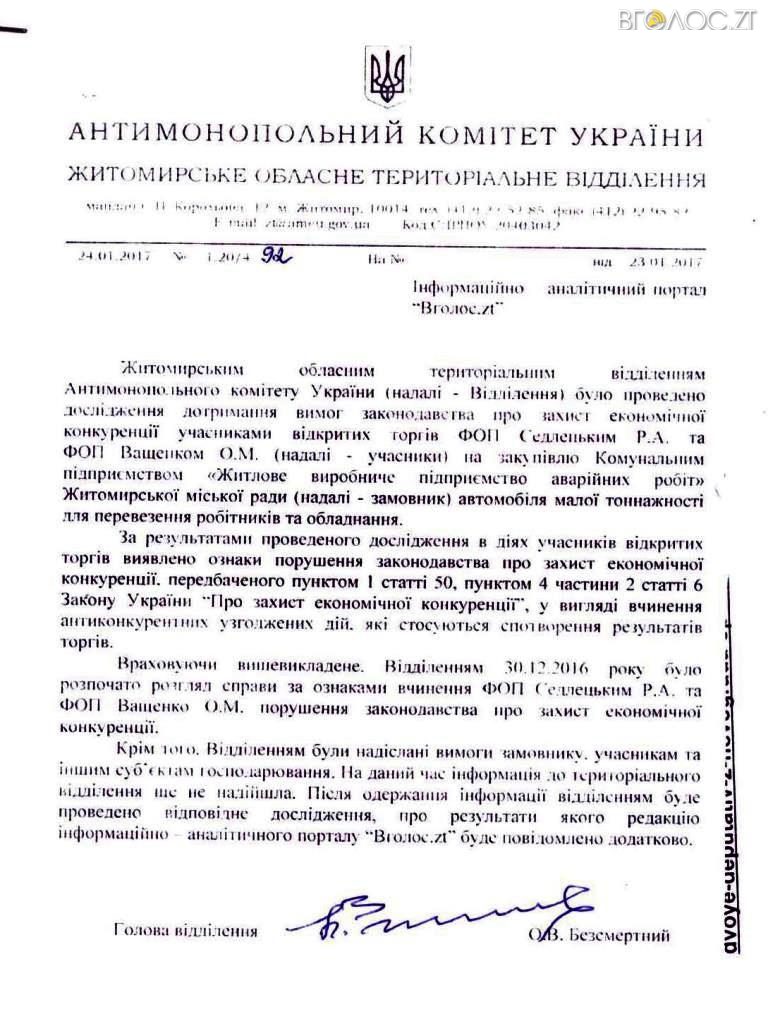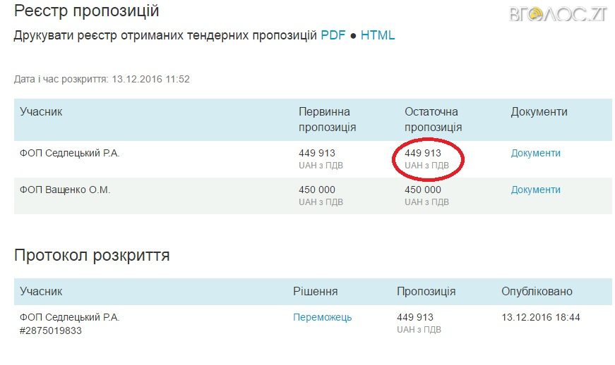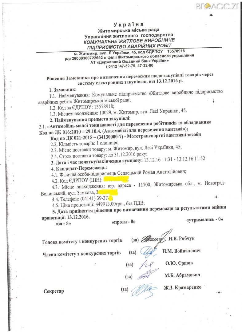 Як повідомляв «Вголос.zt», комунальне підприємство Житомирської міської ради “”Житлове виробниче підприємство аварійних робіт” 24 листопада оголосило тендер на придбання автомобіля для перевезення робітників та обладнання. У торгах взяли участь лише два учасники: ФОП Седлецький Р.А. та ФОП Ващенко О.М. Відповідна інформація міститься на ресурсі публічних закупівель «Prozorro».