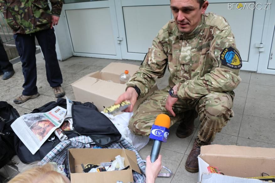 Перед входом у приміщення головного управління Держгеокадастру у Житомирській області близько півсотні людей. Серед них — поліцейські, люди у військовій формі та активісти. Біля самісіньких дверей лежать атрибути, які атошники вилучили у «золотих левів». У ящиках набої, десятки шевронів батальйону «Айдар» та самих «Золотих левів» та газета «Криворожанин».