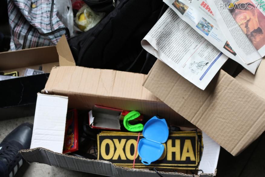 «Це представники Фірташа, які зазіхають на так звані «титанові землі» на Житомирщині. Це справжнісінькі «тітушки». У них було вилучено бронежилет, боксерські засоби тощо, «липові» шеврони «Айдару» та інших бойових підрозділів. Ходили ці хлопці у бронежилетах. Від кого вони захищалися — невідомо», — кажуть самі атошники. Боєць АТО Роман з позивним «Ангел» демонструє журналістам здобуті у боротьбі із псевдоохоронцями «трофеї».