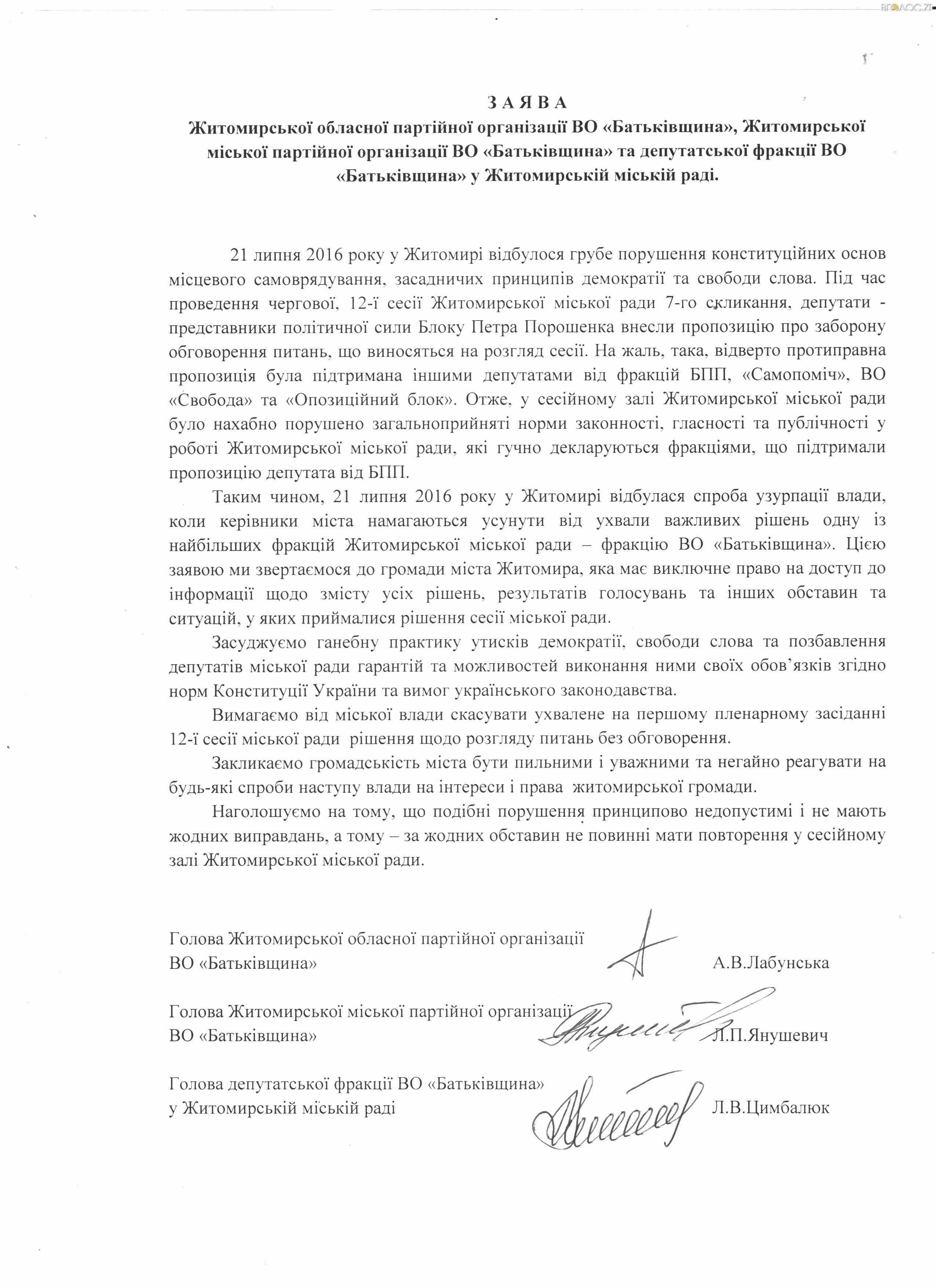 Члени фракції ВО «Батьківщина» вимагають визнати протиправними та скасувати усі рішення сесії міської ради, яка відбулася 21 липня. За словами депутатів фракції, у ході пленарного засідання, яке пройшло з порушеннями, відбулася спроба узурпації влади. Про це вони заявили у зверненні до житомирян, яке є у розпорядженні редакції. Так «Батьківщина» відреагувала на заборону обговорення питань, які виносяться на розгляд сесії, та коментар міського голови Сергія Сухомлина: «…Я понимаю, что мы идем на определенные нарушения…».