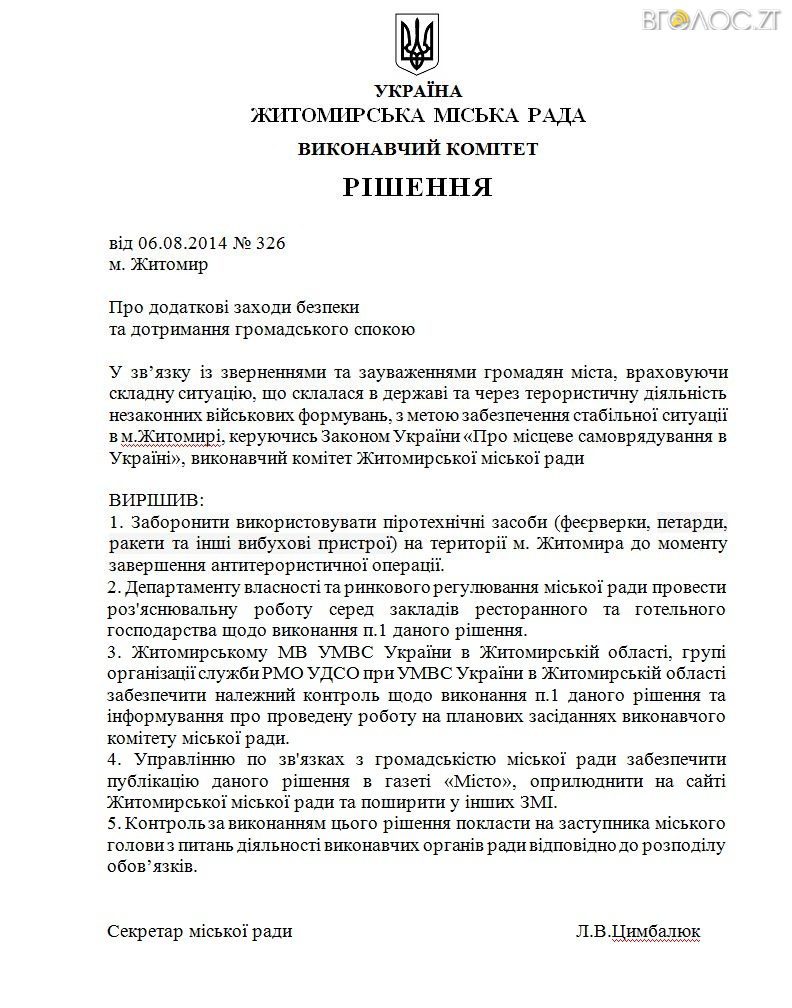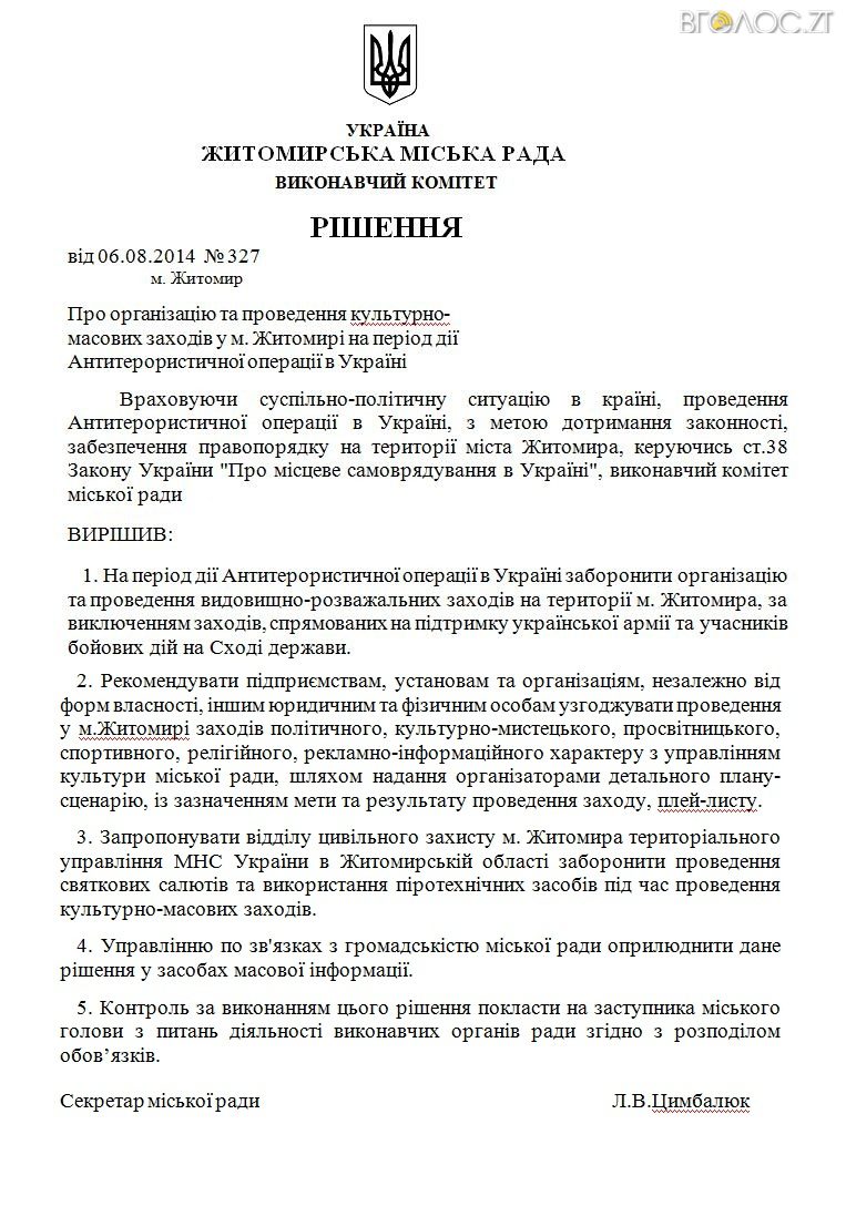 «На період дії Антитерористичної операції в Україні заборонити організацію та проведення видовищно-розважальних заходів на території м. Житомира, за виключенням заходів, спрямованих на підтримку української армії та учасників бойових дій на Сході держави», – йдеться у документі.