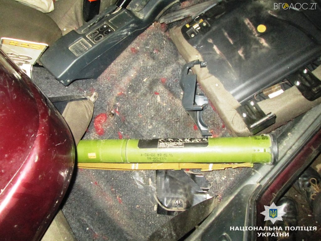 Гранатомет у багажнику автомобіля без номерних знаків правоохоронці виявили вже під час обшуку у гаражі бердичівлянина. Поліцейські встановили, що автомобіль – крадений і шукали його аж з 2015 року.