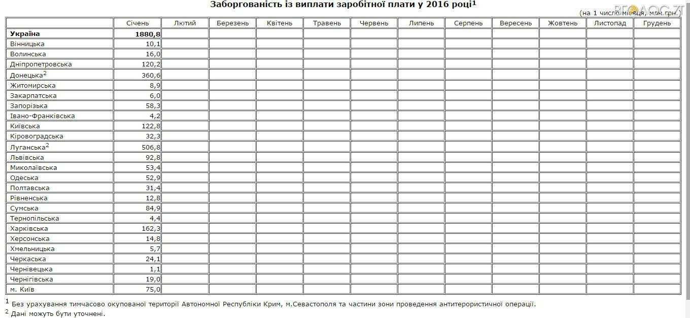 На початку минулого року заборгованість становила понад 12 млн грн. Загалом же станом на січень поточного року заборгованість виплати заробітних плат по Україні становить 1 млрд 880 млн 800 тис. грн.