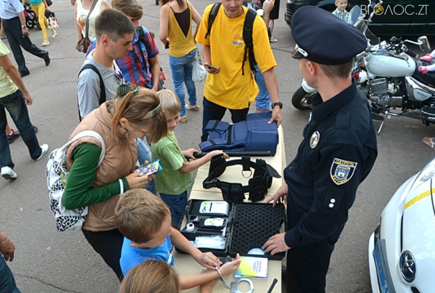 Патрульні поліцейські зібрали довкола своїх транспортних засобів – «Тайоти Пріус» та ескортних мотоциклів – охочих роздивитись їх можливості та зробити селфі від малого до великого.
