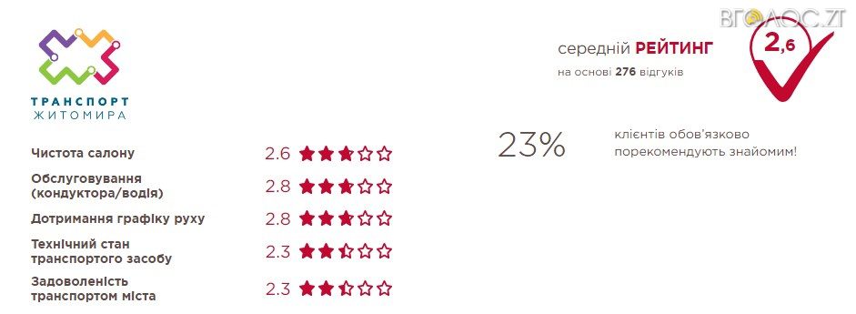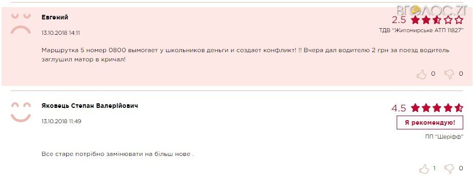 Житомиряни скаржаться на бруд в маршрутках, засмальцьовані та поламані сидіння, хамовитих водіїв, переповнений транспорт та недотримання графіку руху керманичами. З кінця червня майже 300 житомирян скористалися можливістю оцінки якості поїдки у кожному конкретному маршрутному “таксі” з допомогою сервісу “Revision”. Пасажири можуть відсканувати з допомогою смартфону наліпку з QR-кодом та залишити відгук про свою поїздку.