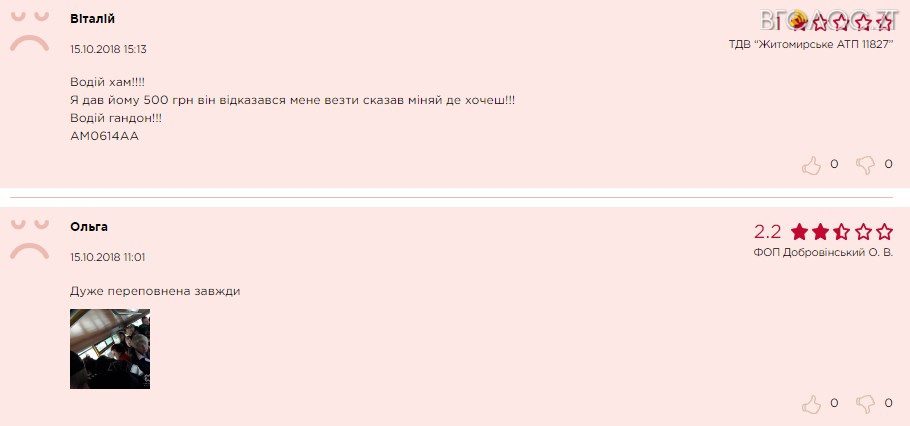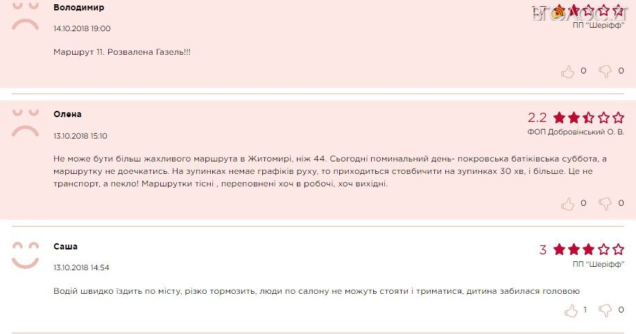 Здебільшого житомиряни скаржаться на бруд в маршрутках, засмальцьовані та поламані сидіння, хамовитих водіїв, переповнений транспорт та недотримання графіку руху керманичами.