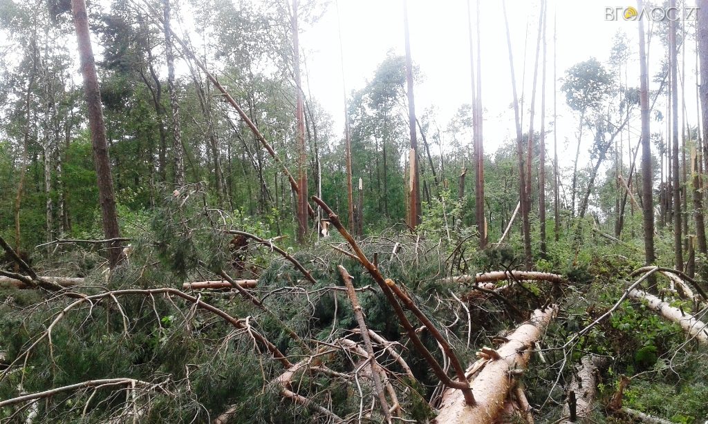 Ліси трьох лісогосподарських підприємств Житомирщини постраждали від стихії, що вирувала в області на минулому тижні. Негода тривала недовго, однак встигла наробити шкоди. Страшної сили вітер виривав велетенські дерева з корінням, інші переламував ніби сірники. Про це повідомила прес-служба обласного лісомисливського господарства.