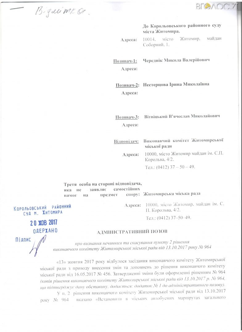 Разом з небайдужими житомирянами скористався конституційним правом звернутися до суду, щоб захистити права людей та оскаржити рішення виконавчого комітету в частині запровадження часових обмежень пільгового проїзду у маршрутках.