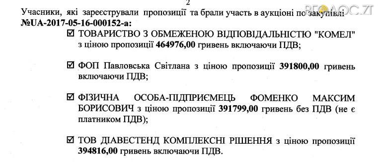 Постачатиме товар фізична особа-підприємець Фоменко Максим Борисович. Відповідно до договору, який вже уклали з київським підприємцем Фоменком 3 липня, вартість 24 комплектів персональних комп’ютерів становить 123 тис. 719 грн, а програмного забезпечення – 268 тис. 80 грн. У аукціоні взяли участь чотири учасники. Не дивлячись на оскарження рішення про визначення переможця у зв’язку «з його неправомірністю та невідповідністю пропозиції ФОП Фоменко технічним вимогам замовника» іншим учасником -підприємцем, яка запропонувала товар лише на одну гривню дорожче, комісія не змінила свого рішення.