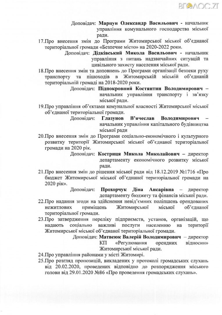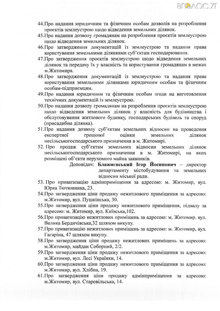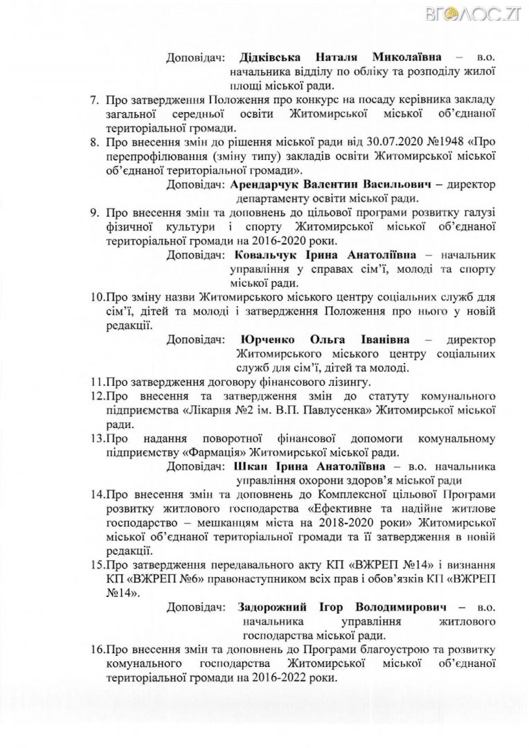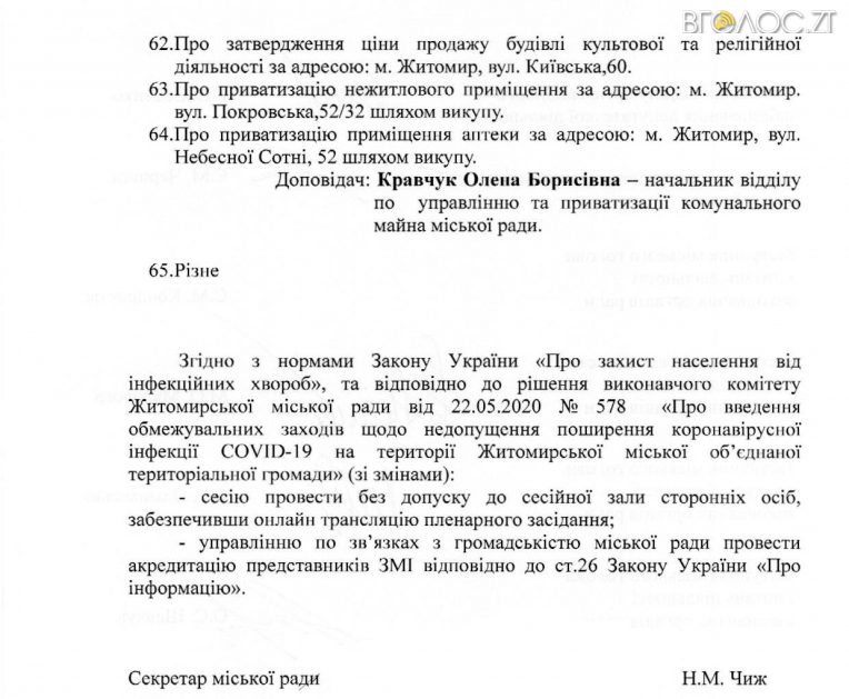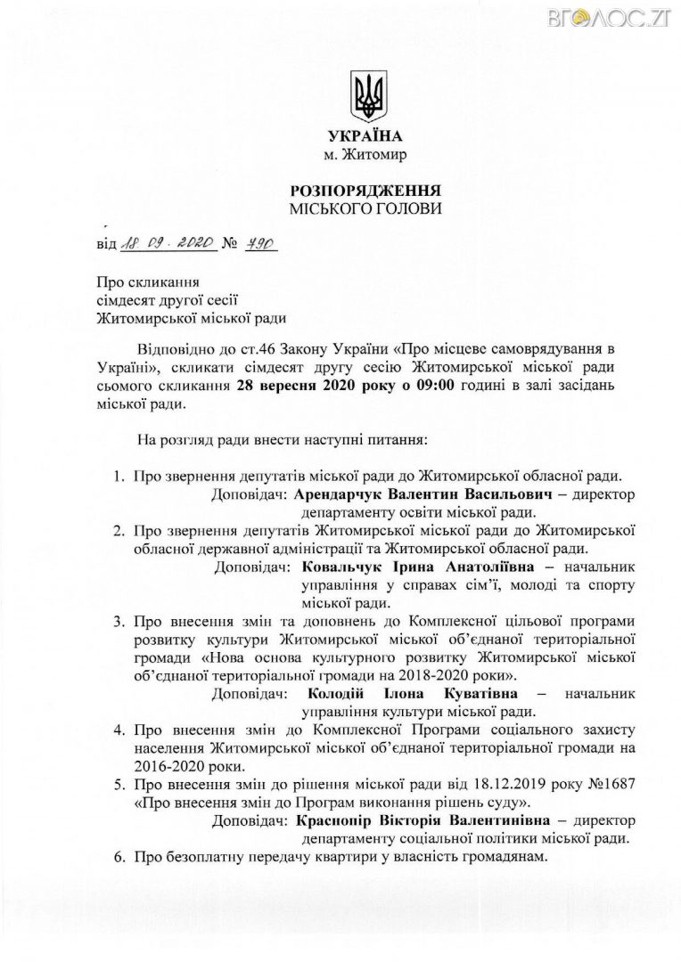 У Житомирі 28 вересня депутати міської ради зберуться на чергову сесію. Відповідне розпорядження про скликання сесії підписала секретар міської ради Наталія Чиж 18 вересня. У порядку денному 65 питань.