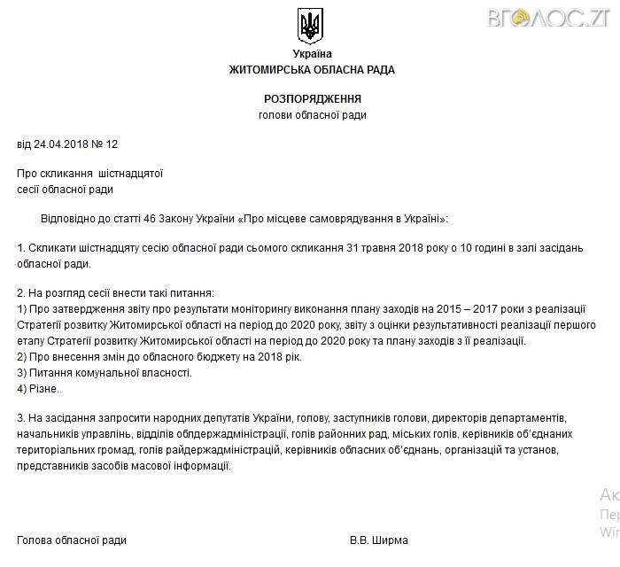 Чергова шістнадцята сесія обласної ради відбудеться 31 травня. Відповідне розпорядження про скликання сесії підписав 24 квітня голова обласної ради Володимир Ширма.