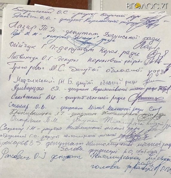 «Ми, депутати Житомирської обласної, міської, районних, селищних та сільських рад, а також депутати об’єднаних територіальних громад, звертаємося до Вас із вимогою завчасно повідомляти про чергові візити Президента України Петра Порошенка на територію області та обласного центру. Зокрема, просимо інформувати депутатів (незалежно від політичної приналежності) про дату, місце та час зустрічей Президента України із населенням області», – йдеться у документі.