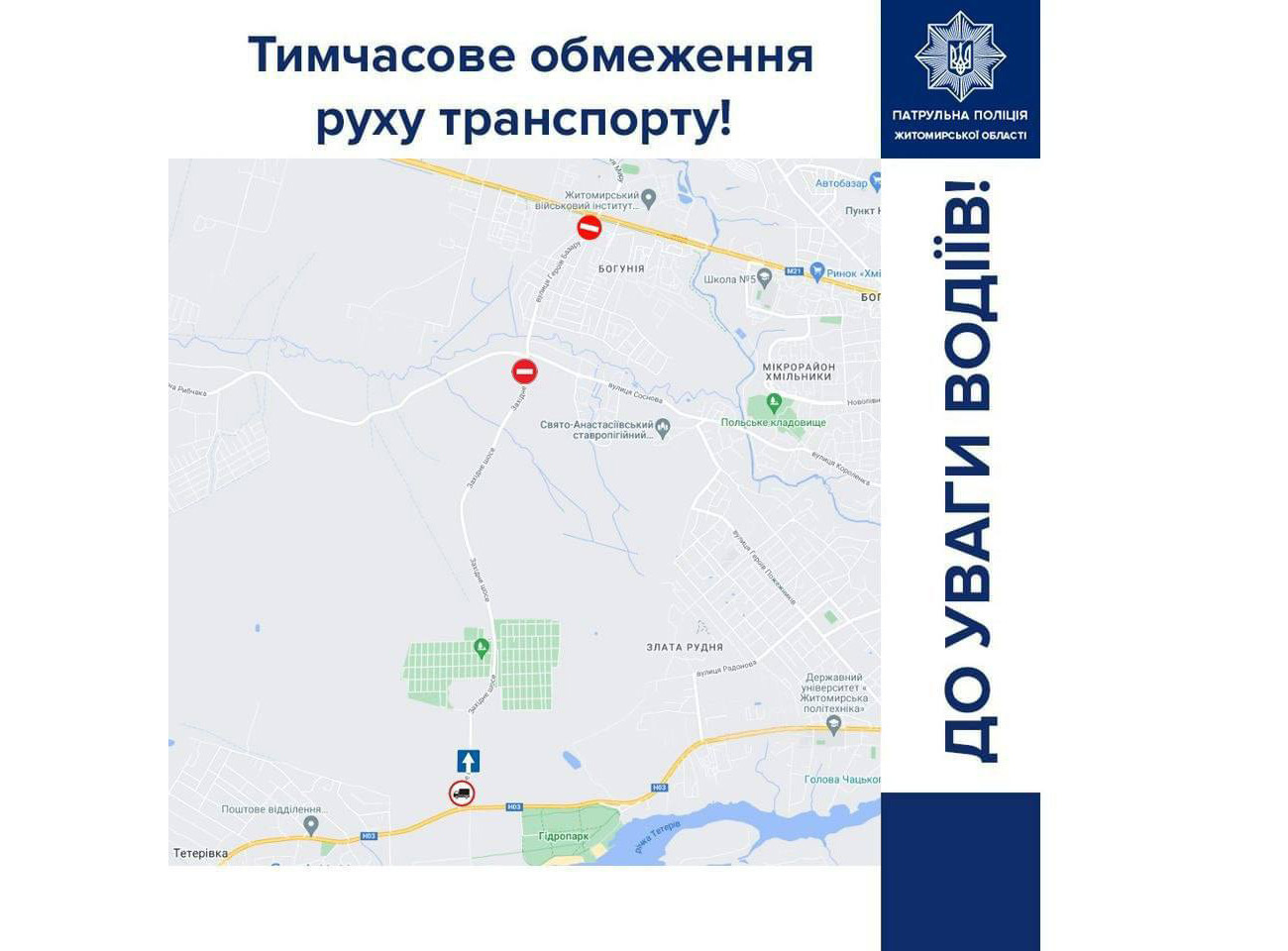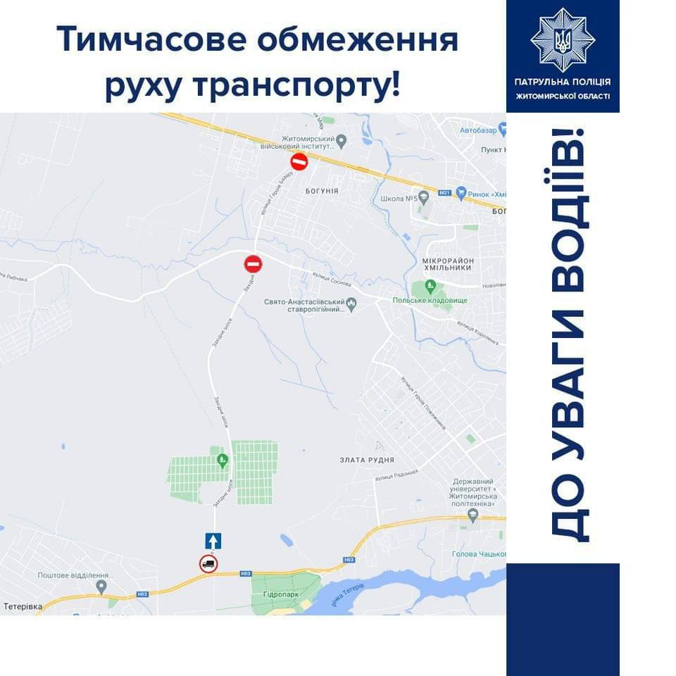 ➖ вантажні транспортні засоби та спецтехніка будуть перенаправлені через місто Житомир.