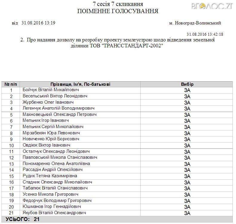 «Надати дозвіл на розробку проекту землеустрою щодо відведення земельної ділянки ТОВ „ТРАНССТАНДАРТ-2002” (код ЄДРПОУ 40489542) площею 3,5937 га для розміщення, будівництва, експлуатації та обслуговування будівель і споруд об’єктів енергогенеруючих підприємств, установ і організацій (код 14.01), яка перебуває у власності Новоград-Волинської міської ради (кадастровий номер 1824086800:05:000:0547). Рекомендувати ТОВ „ТРАНССТАНДАРТ-2002” укласти попередній договір оренди землі з власником земельної ділянки – Новоград-Волинською міською радою із орендною платою у формі та розмірі 12% від нормативної грошової оцінки», – йдеться у документі.