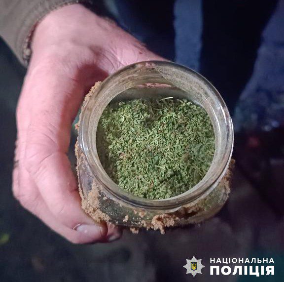 Однак під час «роз’яснювальної бесіди» із агресивним чоловіком правоохоронці помітили в одній із кімнат висушені рослини конопель. Патрульні викликали слідчо-оперативну групу, працівники якої провели невідкладний обшук. Саме під час цих дій поліцейські і знайшли скляну банку з подрібненою сумішшю зеленого кольору на подвір’ї у дитячій пісочниці. Трохи неподалік виявили ще й кущі конопель. Дебошир розповів, що все зберігав для власних потреб.