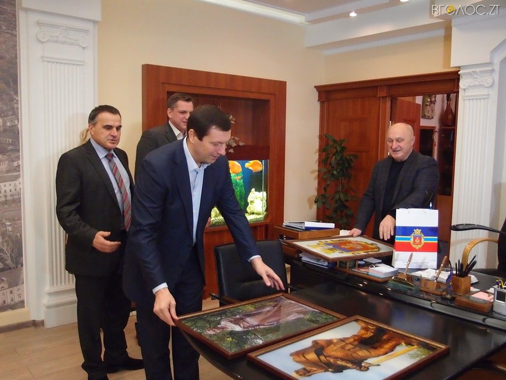 На згадку про зустріч Сергій Дунаєв передав меру Коростеня подарунки з Лисичанська – краєвиди Коростеня, виконані у склі методом сучасних цифрових технологій на відродженому після військових дій Лисичанському склозаводі.