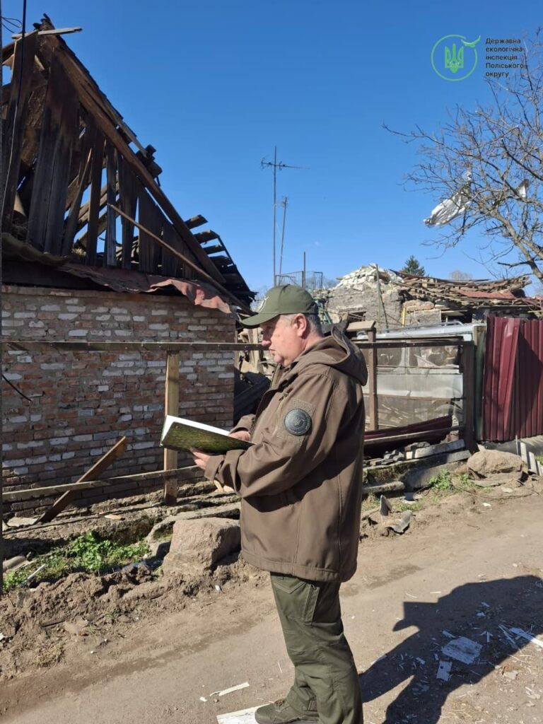 4 березня фахівці Державної екологічної інспекції Поліського округу виїхали на місця влучань у місті Коростень для фіксації наслідків обстрілу.