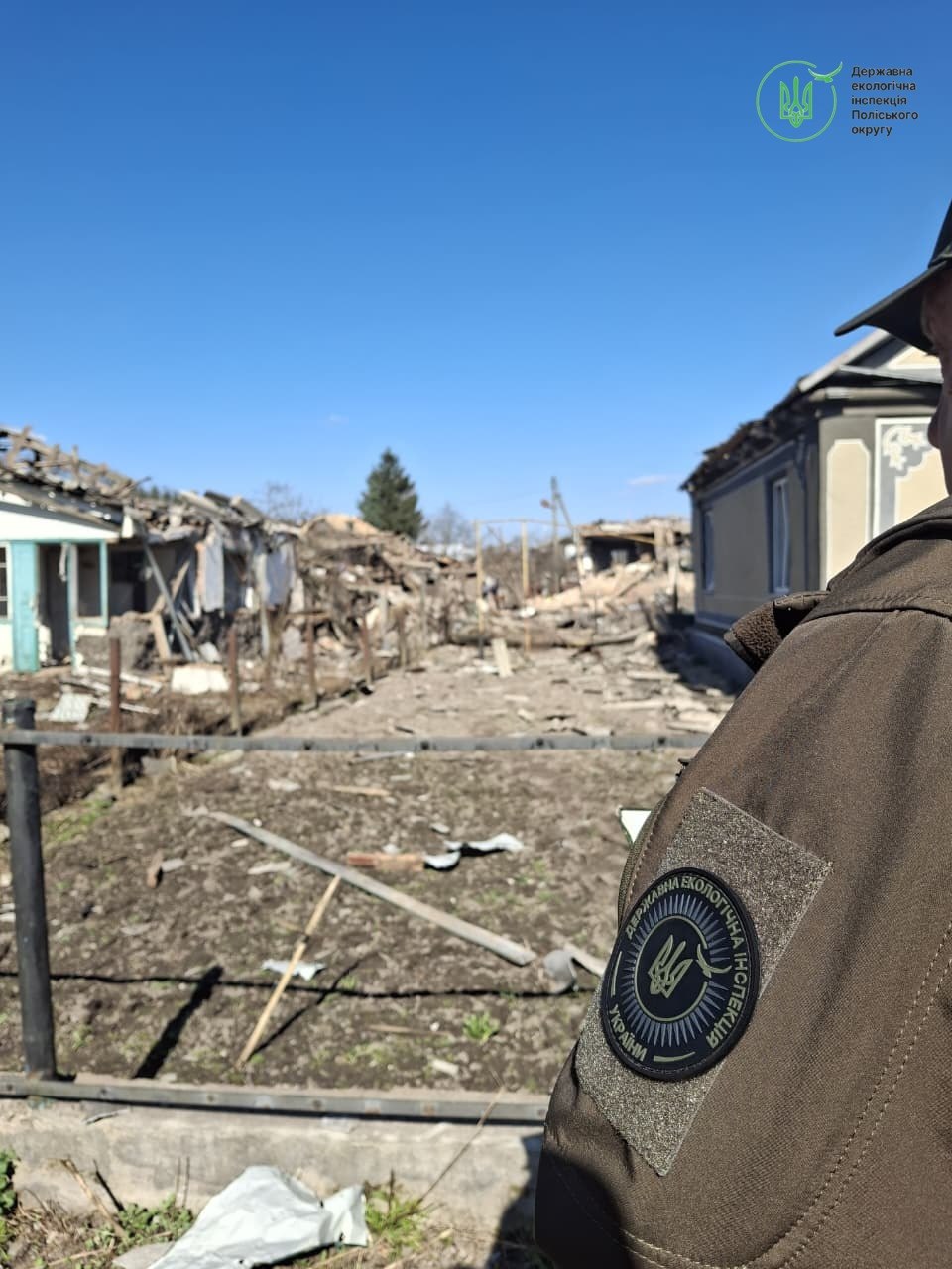 4 березня фахівці Державної екологічної інспекції Поліського округу виїхали на місця влучань у місті Коростень для фіксації наслідків обстрілу.