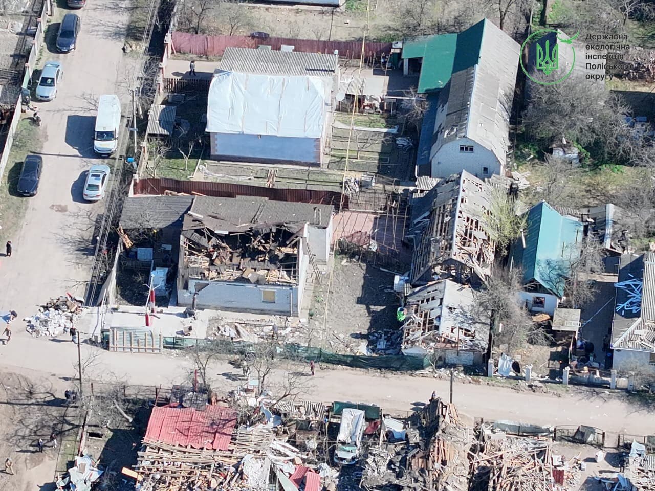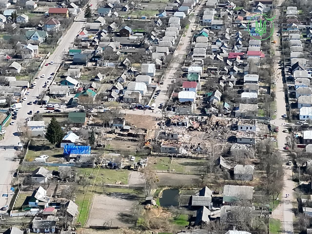 Після завершення роботи правоохоронних органів та огляду місць подій екоінспектори провели обстеження територій, зокрема з використанням дронів, з метою фіксації наслідків руйнувань, визначення площ засмічення територій, що виникли внаслідок утворення відходів руйнації, а також слідів пожеж у місцях влучань.