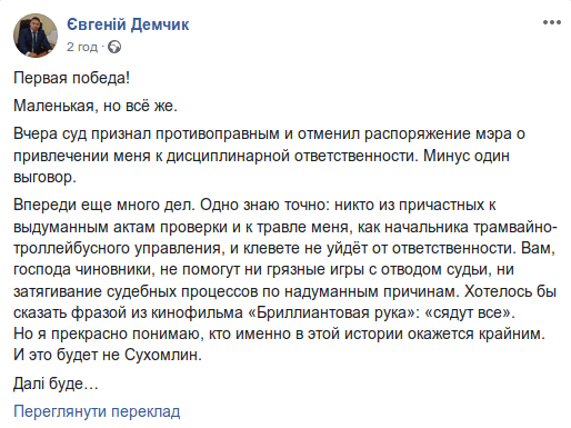 «Перша перемога! Маленька, але все ж. 20 листопада суд визнав протиправним і скасував розпорядження мера про притягнення мене до дисциплінарної відповідальності. Мінус одна догана», – написав Демчик на своїй сторінці у мережі Facebook.