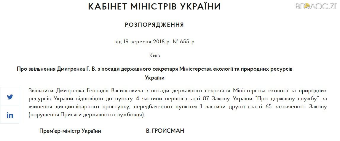 «Звільнити Дмитренка Геннадія Васильовича з посади державного секретаря Міністерства екології та природних ресурсів України відповідно до пункту 4 частини першої статті 87 Закону України “Про державну службу” за вчинення дисциплінарного проступку, передбаченого пунктом 1 частини другої статті 65 зазначеного Закону (порушення Присяги державного службовця)», – йдеться у документі.