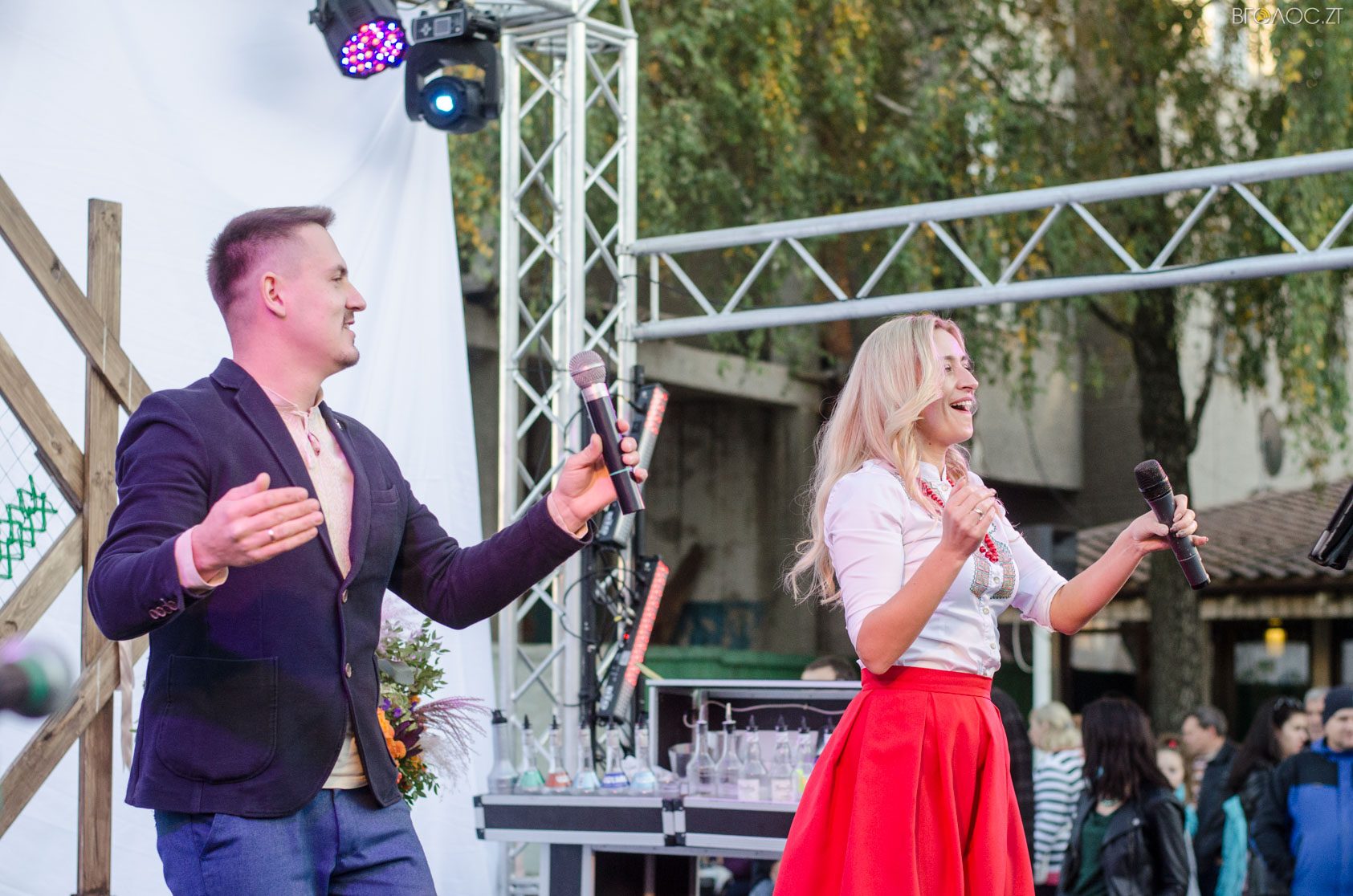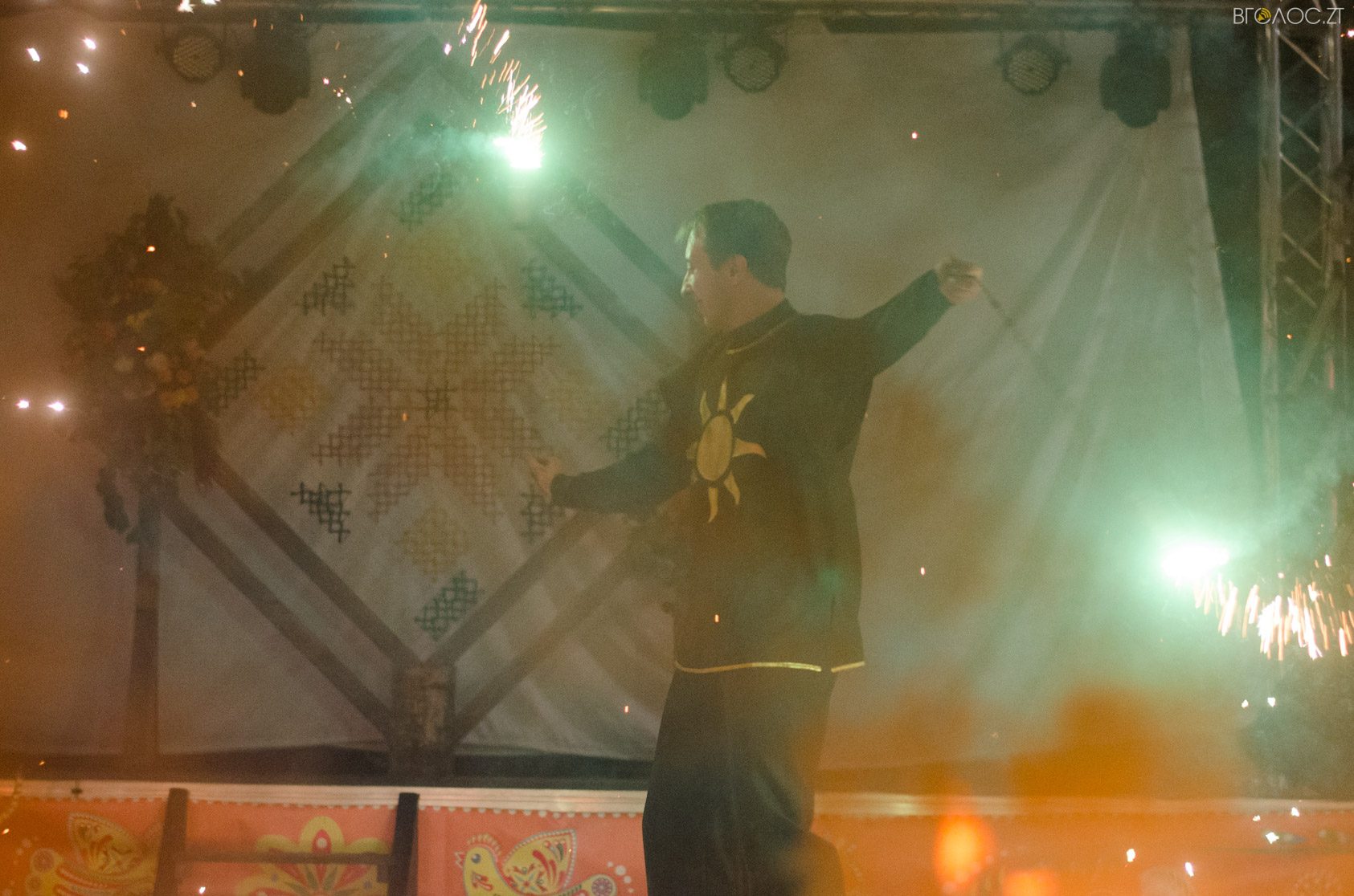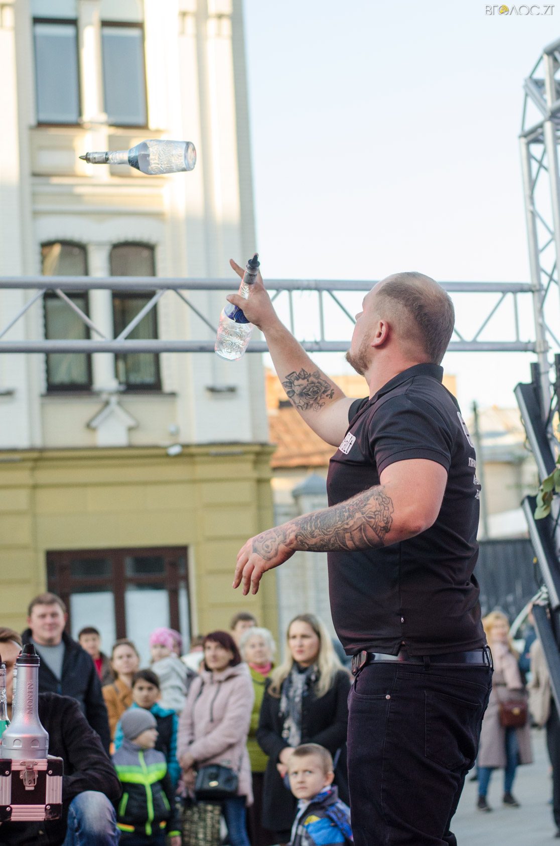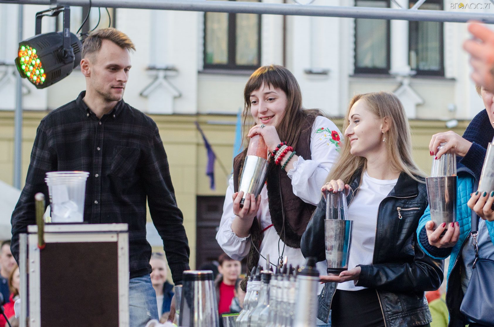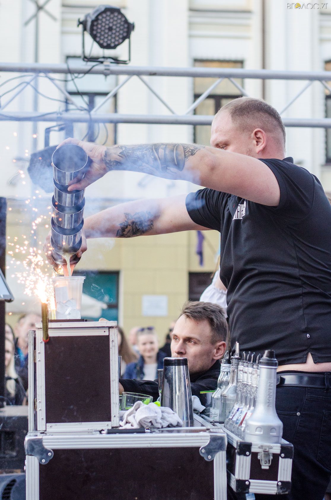 Житомиряни, які зібралися 14 жовтня на Михайлівській, одразу після святкування Покровського весілля побачили яскраве вогняне шоу від студії вогню “Дім сонця” та  бармен–шоу від «Urban Flair».
