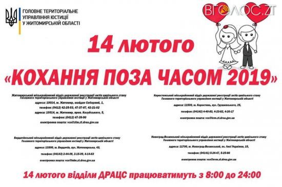 На Житомирщині у День усіх закоханих стартує всеукраїнська акція, ініційована Міністерством юстиції України, «Кохання поза часом-2019».  Саме у  Валентинів день усі закохані, навіть вночі, зможуть подати до відділу державної реєстрації актів цивільного стану заяву про  реєстрацію шлюбу та зареєструватийого, якщо шлюб призначений на 14 лютого. Про це повідомили у Головному територіальному управлінні юстиції у Житомирській області.