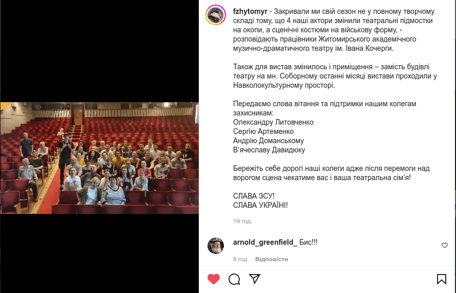 Під час закриття театрального сезону працівники Житомирського академічного музично-драматичного театру ім. Івана Кочерги записали звернення до своїх колег, які нині боронять Україну. Відео оприлюднене у соцмережі Instagram на сторінці «Факти Житомира».
