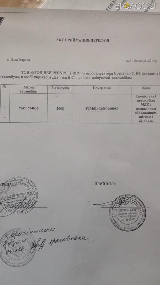 У КП «Зеленбуд» кажуть, що разом із автомобілем приватне товариство не доставило необхідні документи для його реєстрації. Тому комунальне підприємство зверталося до суду, який житомиряни виграли. Підтверджуючі документи є у розпорядженні редакції.
