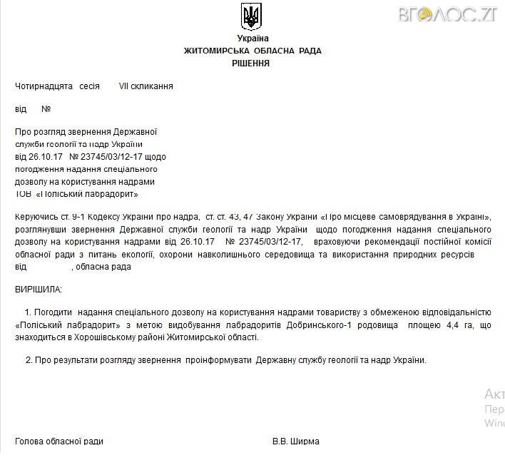Відповідно до документу, погодити надання спецдозволу на користування надрами згаданому товариству з обмеженою відповідальністю мають з метою видобування лабрадоритів в Хорошівському районі. Мова йде про Добринське-1 – родовище площею 4,4 га. Відповідно до єдиного державного реєстру юридичних осіб, фізичних осіб-підприємців та громадських формувань, ТОВ «Поліський лабрадорит» зареєстроване у Хорошеві. Серед засновників – кияни Юлія Калініна, Ілля Селуянов та дві столичні компанії, які заснували ті ж самі кияни, а також кілька фірм, зареєстрованих на Сейшельських островах і в столиці Лівану. Цікаво, що аналогічний проект рішення на сайті обласної ради публікували й у червні цього року.