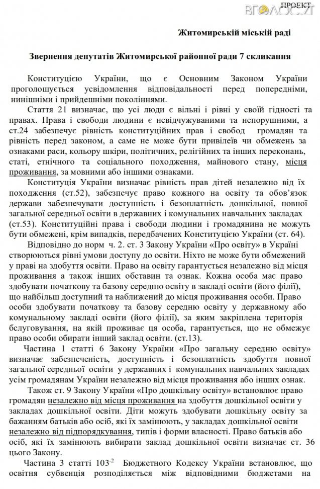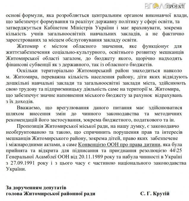 Лист із вимогою передбачити у бюджеті Житомирського району компенсацію за навчання дітей надійшов до районної ради 11 лютого 2018 року. Рішення щодо такої «компенсації» сесія Житомирської міськради прийняла ще 18 грудня 2017 року.