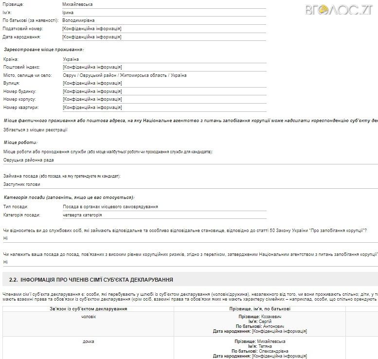 Заступницею голови РДА є Ірина Михайлевська. Згідно з рішенням сесії районної ради від 23 червня 2017 року № 268, Михайлевська разом з іншими депутатами проголосувала за список присяжних для кримінального провадження в Овруцькому районному суді в кількості 12 осіб. Зокрема, в списку зазначене ім’я чоловіка Ірини Михайлевської – Сергій Козакевич.