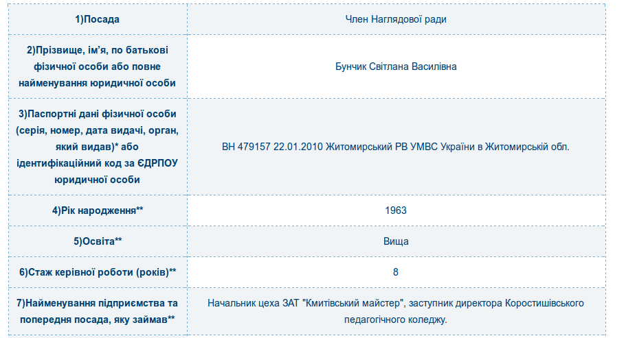 Втім, логіка такого рішення тендерного комітету стає цілком зрозумілою при аналізі списку посадових осіб ПрАТ “Кмитівський майстер”. Заступник директора Коростишівського педколеджу, заступник голови тендерного комітету Світлана Бунчик, виявляється, є членом Наглядової ради ПрАТ “Кмитівський майстер”. Інформацію про те, що Світлана Бунчик є також заступником керівника Коростишівського педколеджу, на яку безпосередньо покладено проведення тендерних торгів у закладі, підтвердили нам по телефону. Більше того, відомості про це містить сайт коледжу.