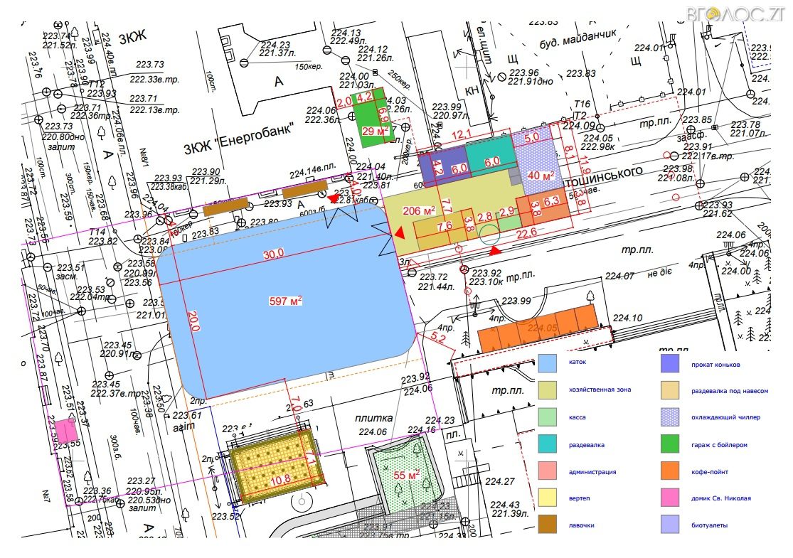 У планах облаштувати каток розміром 597 кв. м, роздягальні, пункти прокату ковзанів, адміністрацію та кава-пойнти.