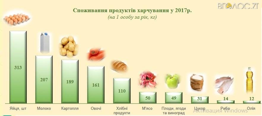 За інформацією статистів, у минулому році кожен з’їв 50 кг м’яса, 14 кг риби, 31 кг цукру, 110 кг хлібних продуктів, 49 кг фруктів. Крім того, випив 207 літрів молока, а також використав 12 літрів олії.