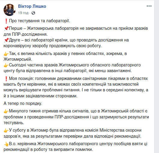 Житомирський обласний лабораторний центр не зупинятиме прийом зразків для ПЛР-дослідження. Про це на своїй сторінці у Facebook написав головний санітарний лікар України Віктор Ляшко.