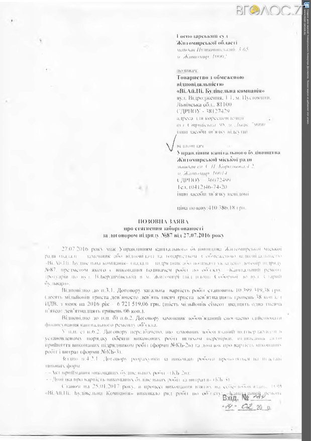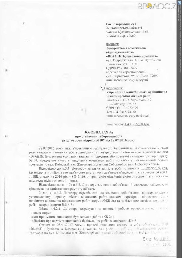 «Стягнути з Управління капітального будівництва Житомирської міської ради на користь ТОВ «Ві.Ай.Пі. Будівельна компанія» 410 тис. 386 грн заборгованості за договором підряду №107 від 28.07.2016 року за капітальний ремонт вулиці Великої Бердичівської та 1 млн 432 тис. 622 грн 08 коп. за вулицю Київську», – просить у позовній заяві львівська фірма.