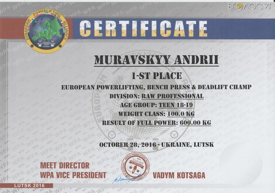 «Серед спортсменів віком до 19 років у ваговій категорії до 100 кг Андрій показав такі результати: присідання зі штангою – 210 кг, жим лежачи – 150 кг, станова тяга – 240 кг і в сумі – 600 кг. Цей результат виявився найкращим і студент ЖНАЕУ – Андрій Муравський виборов титул чемпіона Європи», – йдеться у повідомленні.
