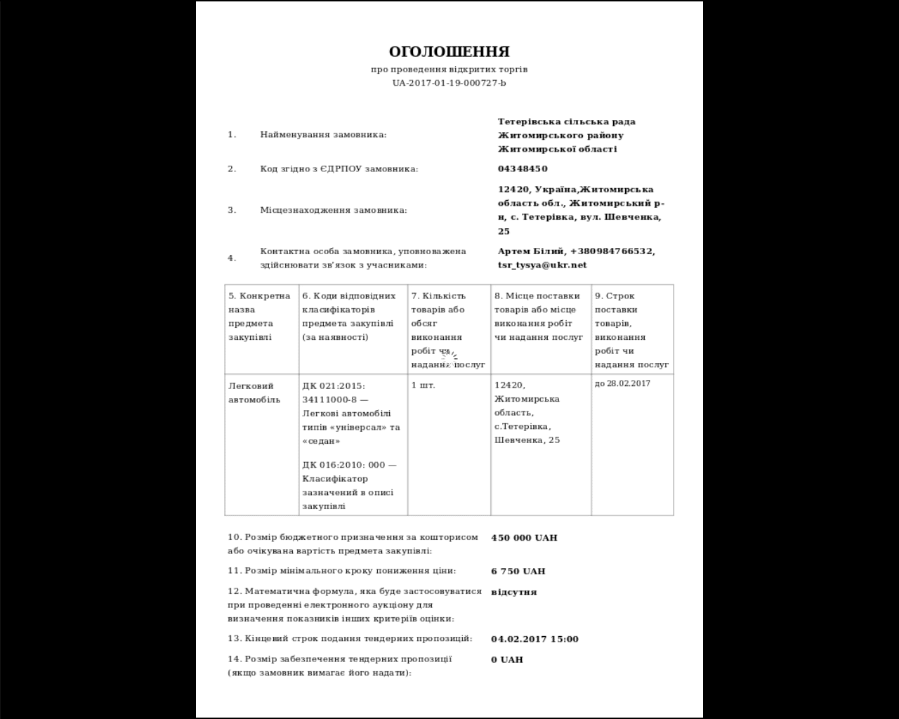 Тетерівська сільська рада, схоже, вирішила іти «в ногу з часом» і услід за Новоград-Волинською міською радою хоче придбати автомобіль за 450 тис. грн. Інформацію про це розміщено на порталі публічних закупівель «ProZorro».