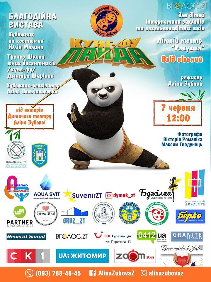 У Житомирі 7 червня відбудеться благодійна вистава «Панда кунг-фу» для дітей інтернатних закладів, загальноосвітніх шкіл, літніх таборів та для всіх охочих поринути у казковий світ театрального мистецтва. Про це повідомила організатор заходу та режисер театральної студії Аліна Зубова.