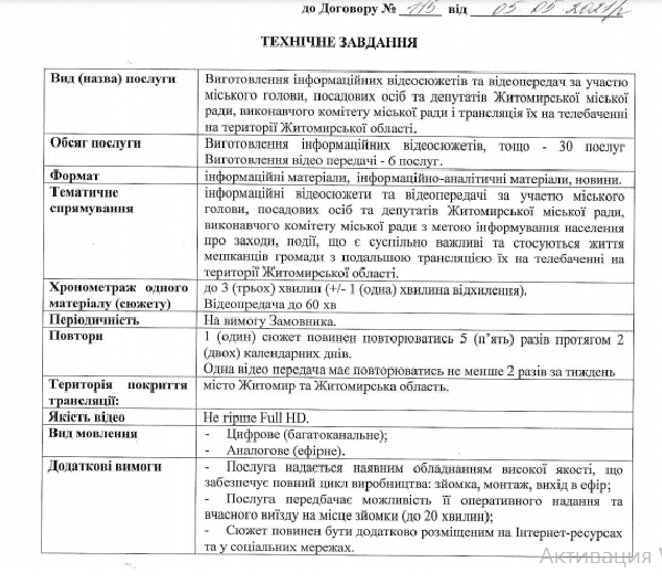 Житомирська міська рада заплатить товариству з обмеженою відповідальністю “Телерадіокомпанія “Союз-тв” 238 000 грн за послуги з виготовлення і трансляцію інформаційних відеосюжетів та відеопередач за участю міського голови, посадових осіб, депутатів та виконавчого комітету.